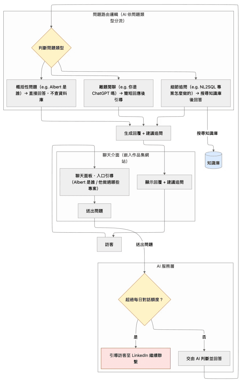 Portfolio AI Bot 是一個部署在作品集網站上的對話式 AI 助手,讓訪客不用讀完整份頁面,直接用問題切入了解 Albert( 右下角互動體驗 👉 )