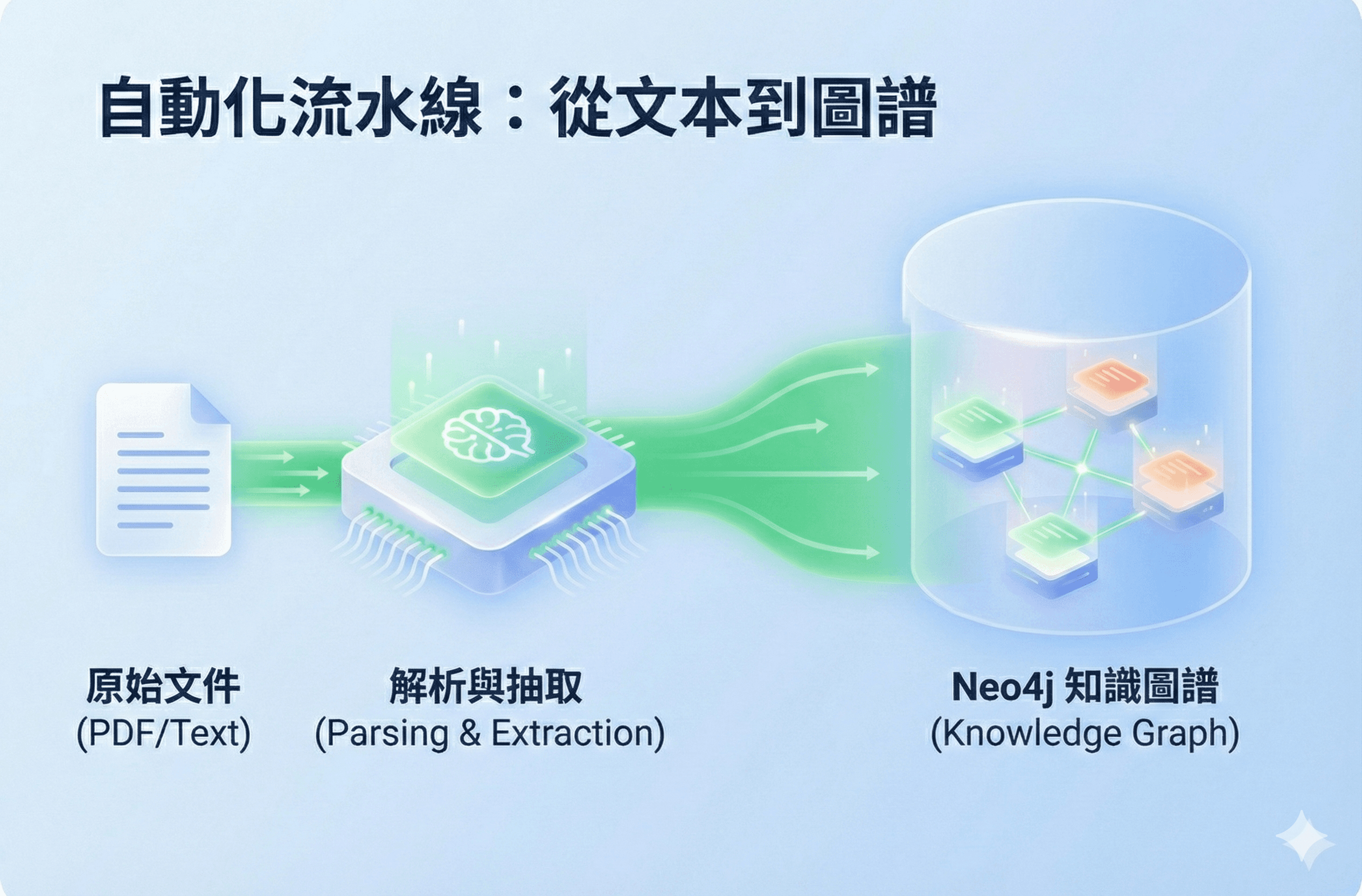 利用 LLM 輔助 Docling 解析 API 串接、Neo4j Cypher 查詢語句與 React 前端視覺化邏輯,在極短時間內( 1 週 )完成了從資料庫 schema 設計到前端互動的原型搭建,證明了 PM 具備快速驗證深層技術假設的能力。建構自動化知識圖譜流水線(Data Ingestion Pipeline)
