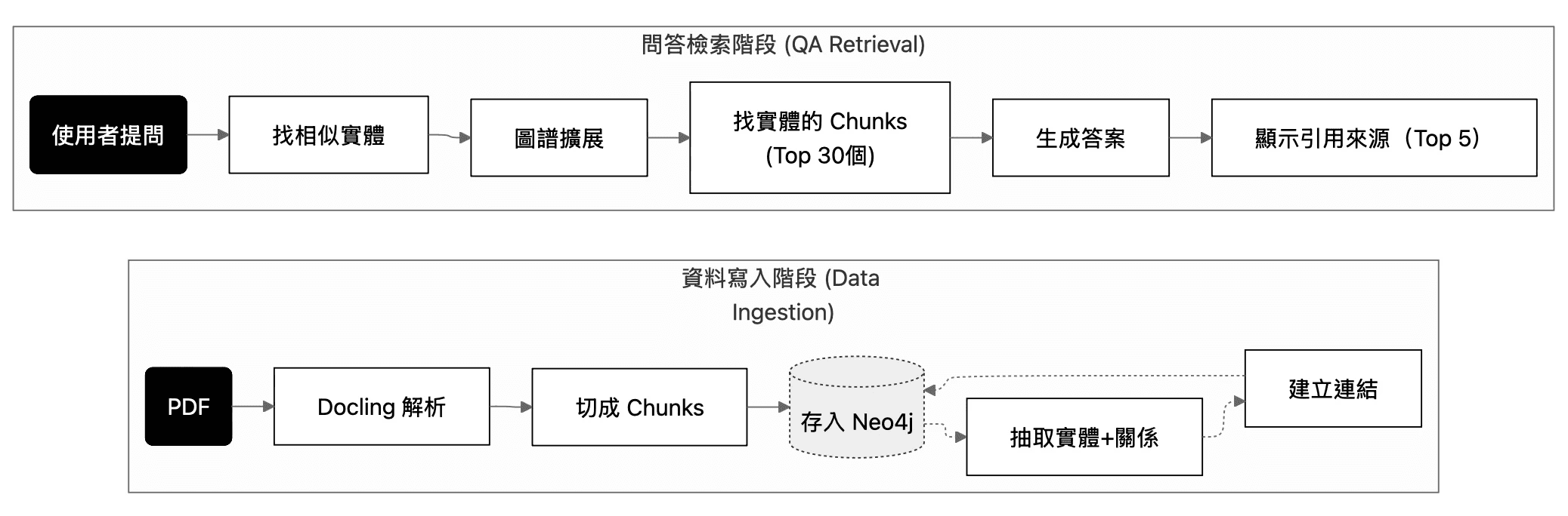 為解決此痛點,本專案引入 GraphRAG(圖譜增強檢索),旨在驗證透過 Neo4j 建構知識圖譜,能否利用「實體關係」補充傳統檢索的不足,抓取文件中的隱性脈絡,以滿足客戶端對於高精準度問答的嚴苛要求。