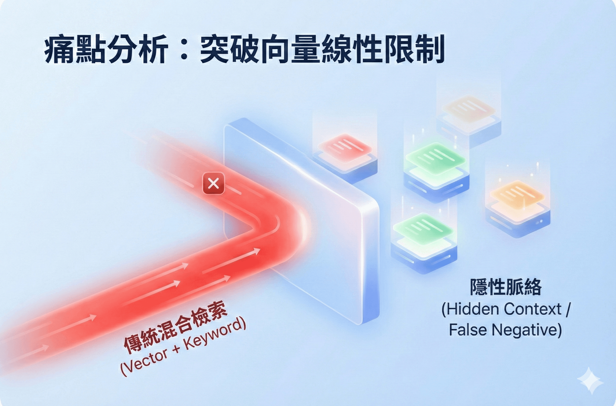 由於產品既有的「關鍵字 + 向量」混合檢索高度依賴餘弦相似度,在處理企業內部繁雜文件時,經常無法有效召回「邏輯緊密但字面/向量距離較遠」的關鍵段落(False Negative)。