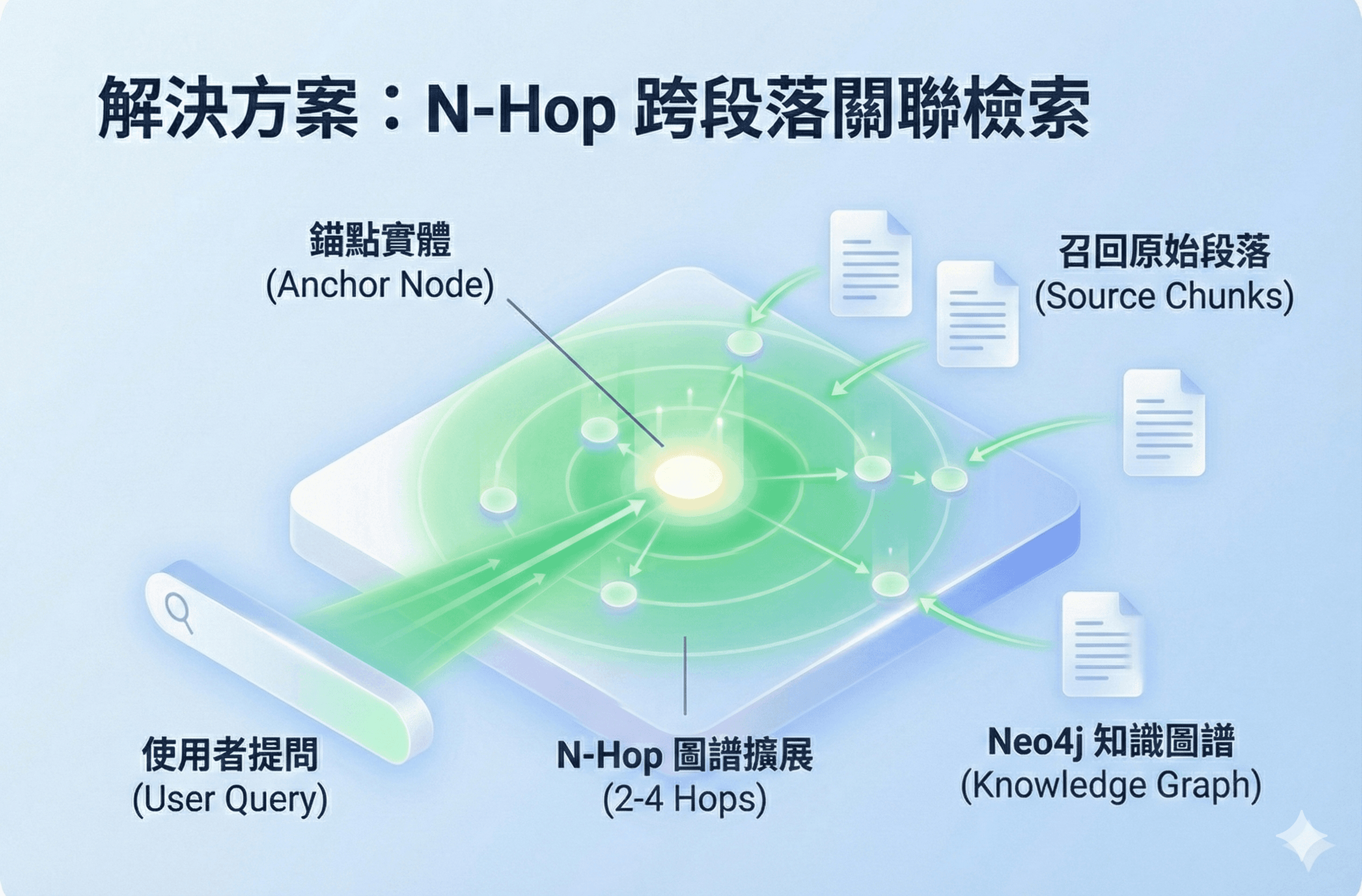 接著執行 N-Hop(多跳)圖譜擴展(預設 2-4 Hop),抓取與錨點具備強關聯的周邊節點