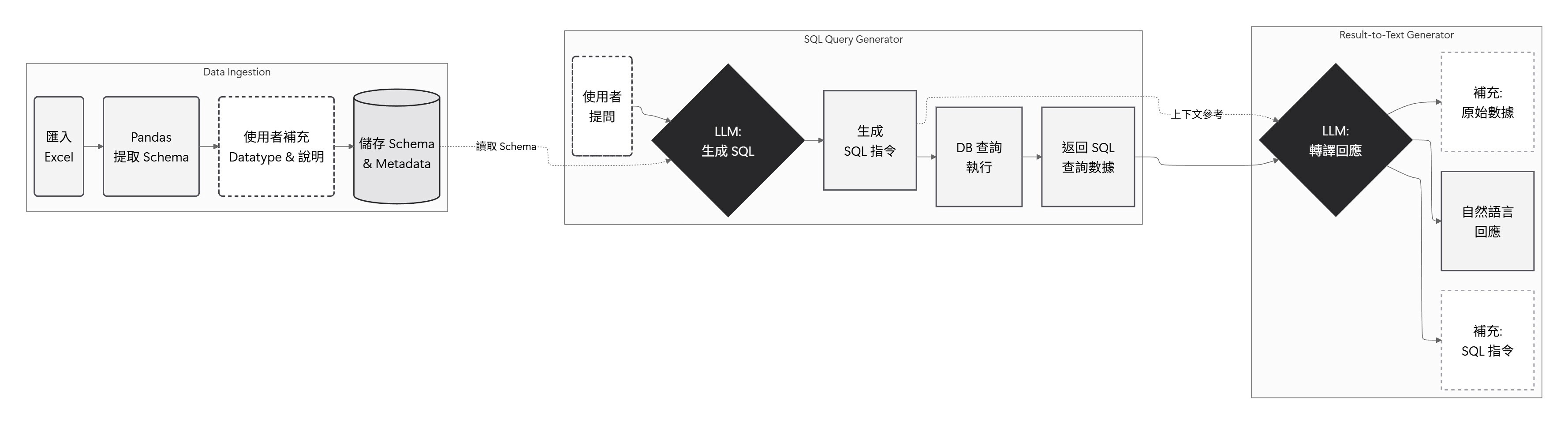 針對企業報表、財務數據等高精確度場景,本專案不依賴語言模型的生成能力進行計算,而是 將自然語言轉譯為可執行的資料庫查詢指令(SQL)。核心價值在於實現「數據民主化」,讓非技術人員(如業務、管理層)能透過對話直接獲取準確的數據洞察,同時確保數據來源的 100% 可驗證性,消除 AI 在數值上的幻覺風險。