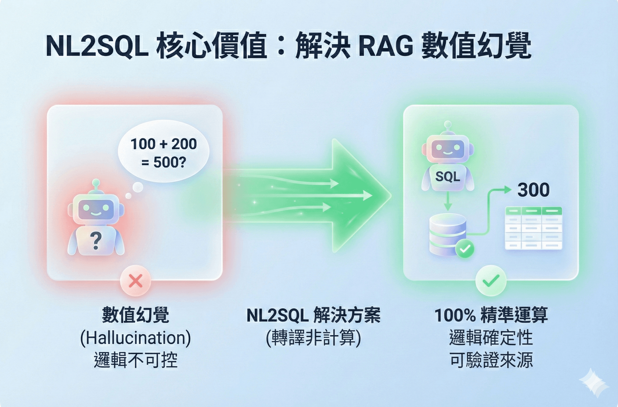 識別現有 RAG 產品在處理結構化數據時的「數值幻覺」問題,確立以 NL2SQL 查詢真實資料的解決方案,取代混合檢索(關鍵字 + 向量)的產品方向