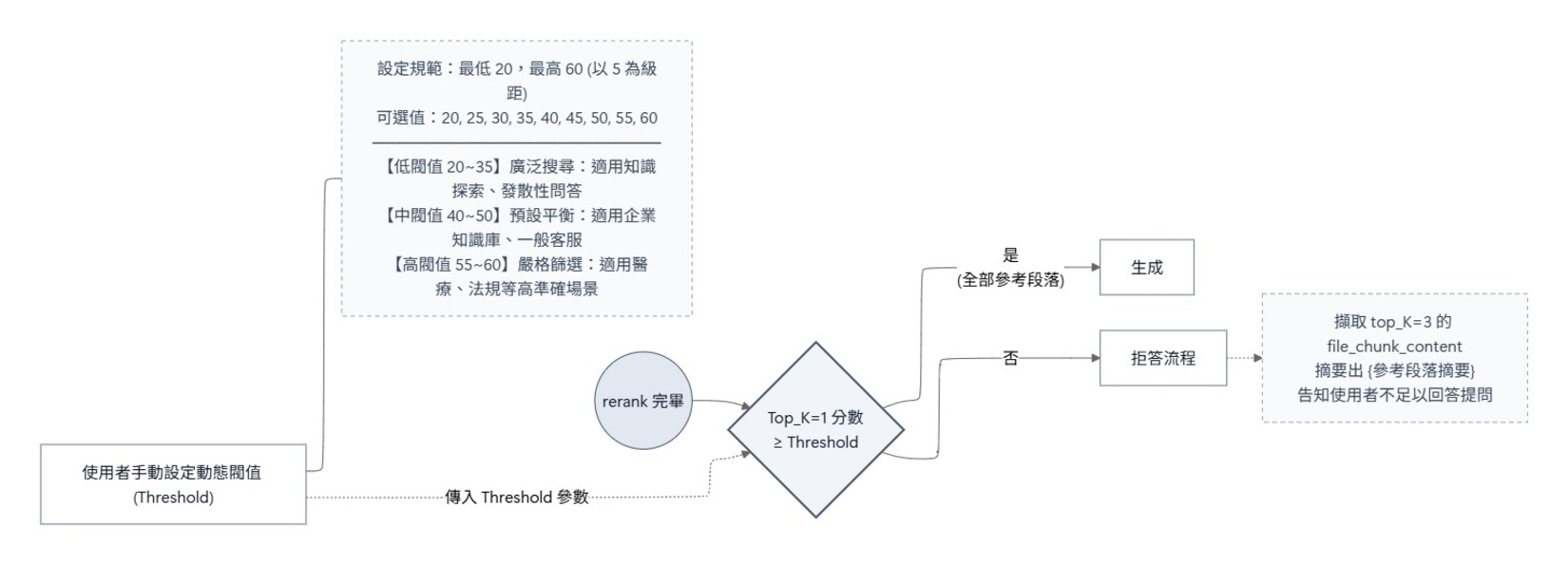 在 AI 生成答案之前強制設下門檻:系統搜尋到的最相關參考資料(Top_K=1)相關度分數須達 40 分以上,才會進入生成流程;未達標則直接回應「找不到足夠可信的參考資料」。同時兼顧資安防線設計,確保知識存取的合規邊界。