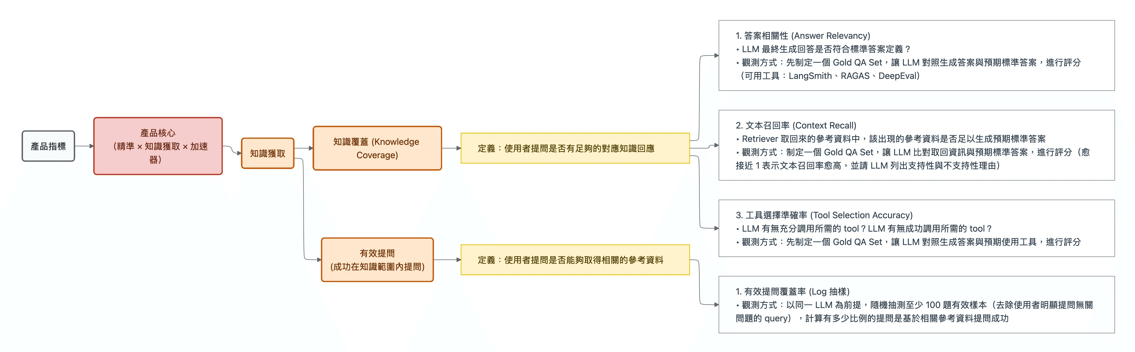 有效提問覆蓋率只有 68% 的根本原因有兩個:知識庫有盲點、使用者不知道怎麼問。因此將「有效提問 ✕ 知識覆蓋 = 知識理解 」視為產品標準規格,確保高機率「成功從參考段落取得關聯知識」: