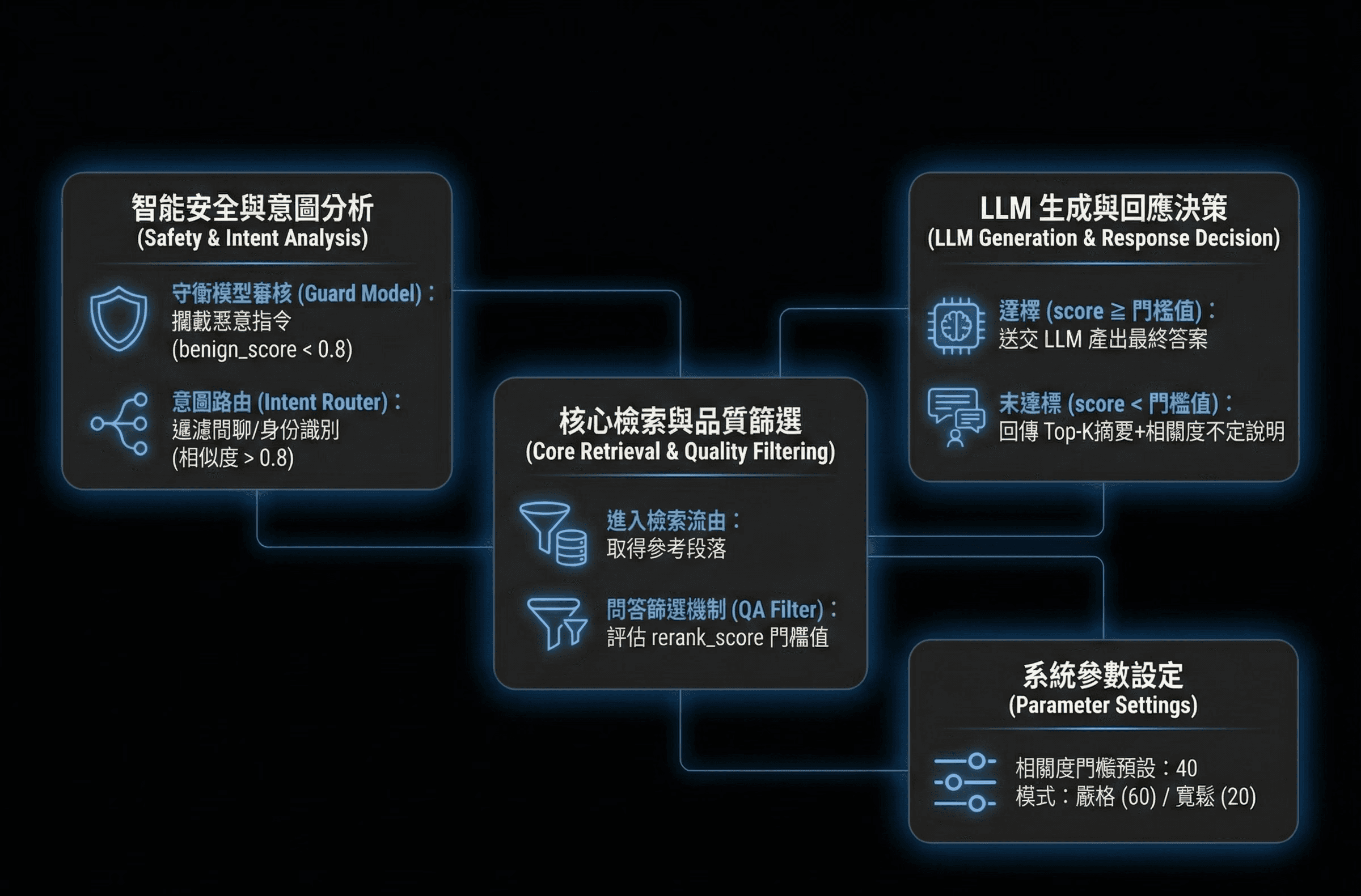執行細節:在檢索後、生成前加入判斷邏輯。若 Top_K=1 Rerank Score < 門檻值(預設 40),則觸發 Fallback 機制,僅回傳段落摘要而不進行生成