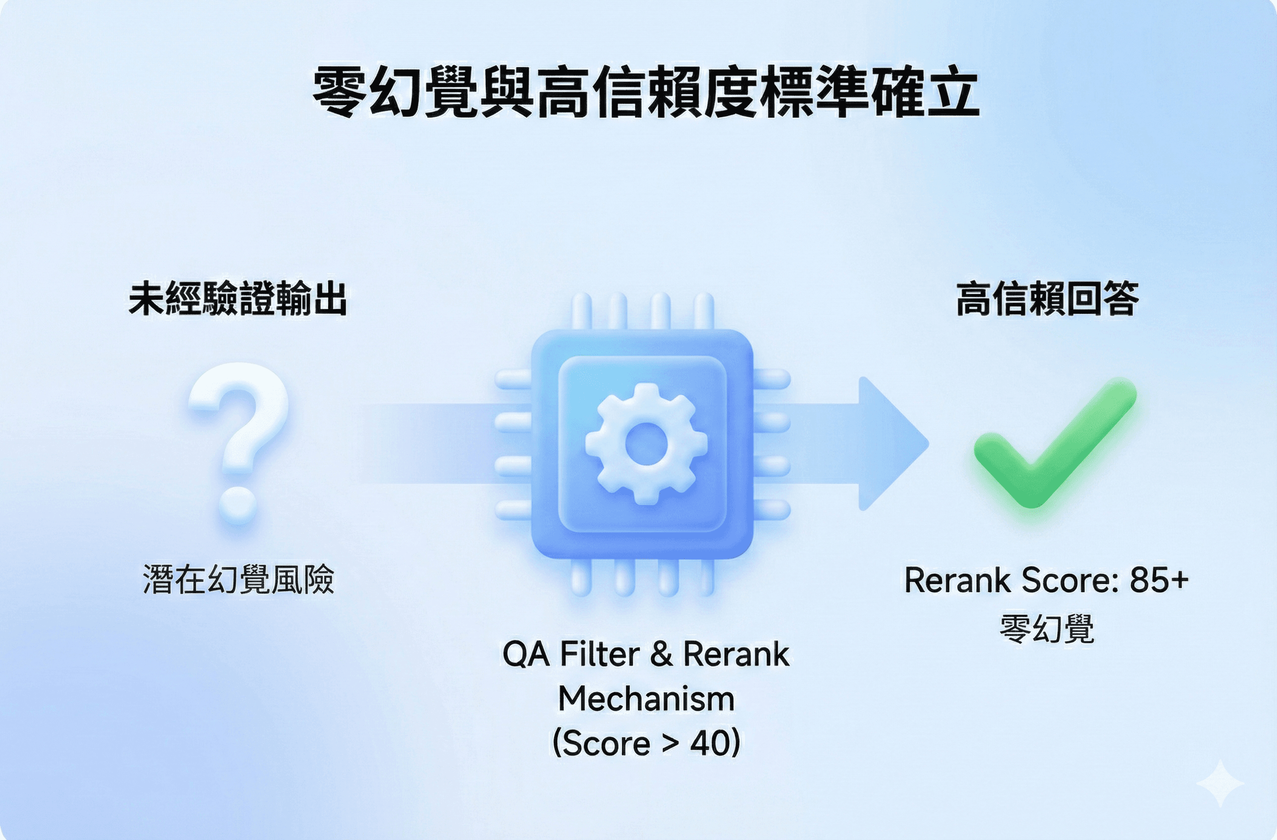 針對幻覺問題,在檢索層(Retrieval)導入 Rerank 機制。我們不再盲目相信檢索結果,而是強制規定 Top_K=1 的段落分數必須超過預設門檻(40分),否則系統將回傳「相關度不足說明」並拒絕生成。這從根本上杜絕了模型「一本正經胡說八道」的可能性。