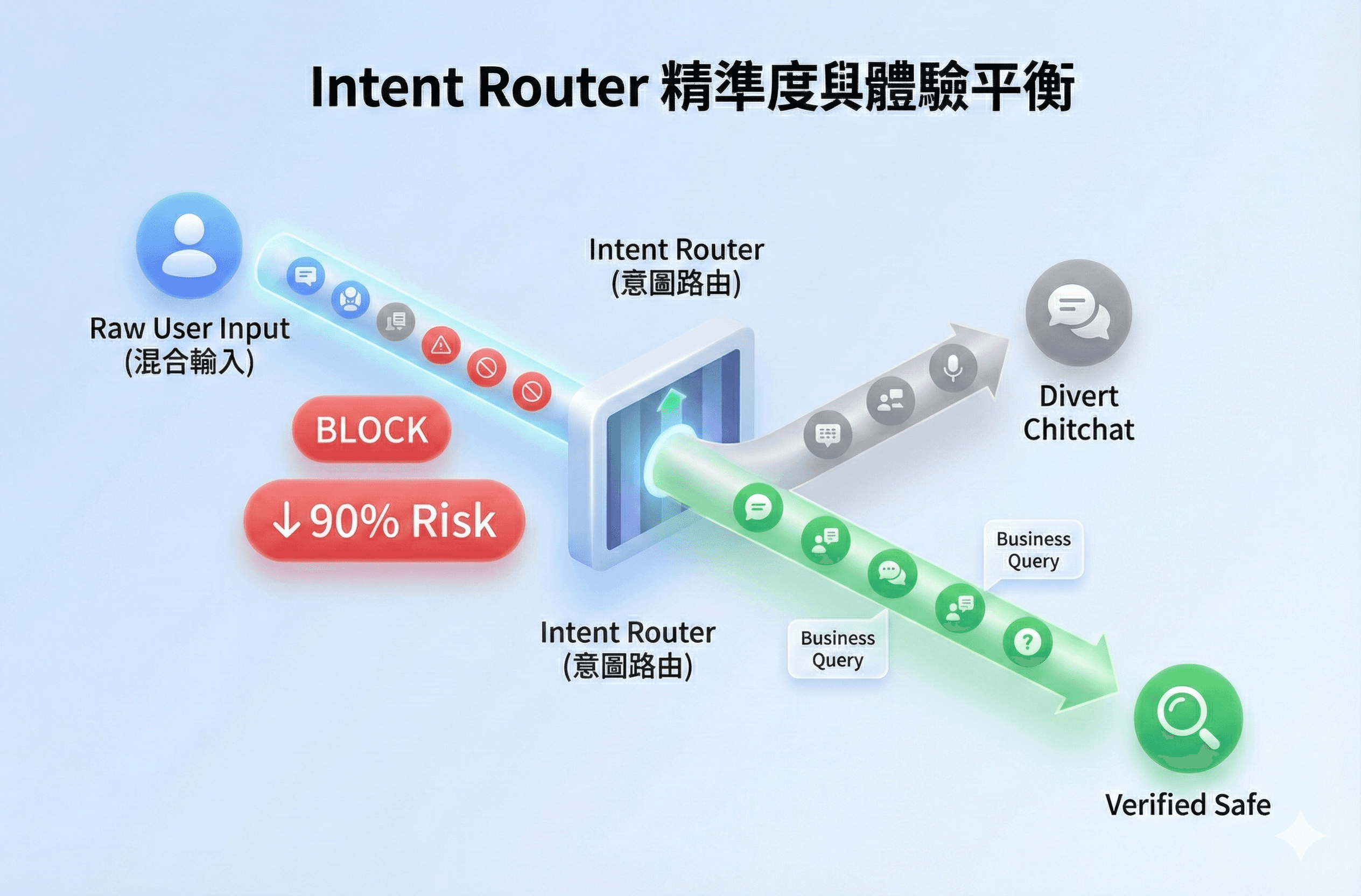 在意圖路由(Intent Router)上線後,透過持續的 Log 監測與閾值微調,成功將正常提問被誤判為惡意/閒聊的比率控制在 1% 以下,證明了該架構在提升安全性的同時,未犧牲正常使用者的體驗