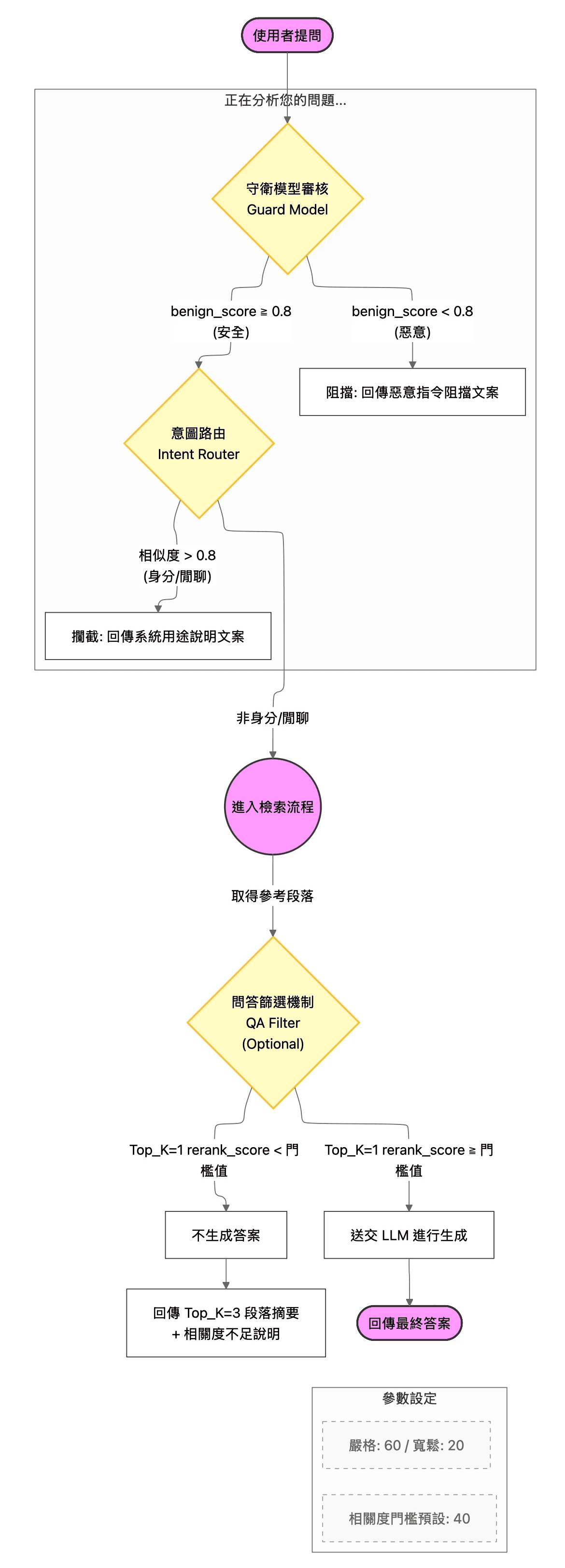 透過 Intent Router 與 QA Filter 的雙重把關,徹底解決了模型「身分洩露」與「低相關度強行回答」的兩大頑疾。這不僅滿足了企業合規需求,更建立了客戶對 AI 系統「不說謊、不洩密」的深度信任