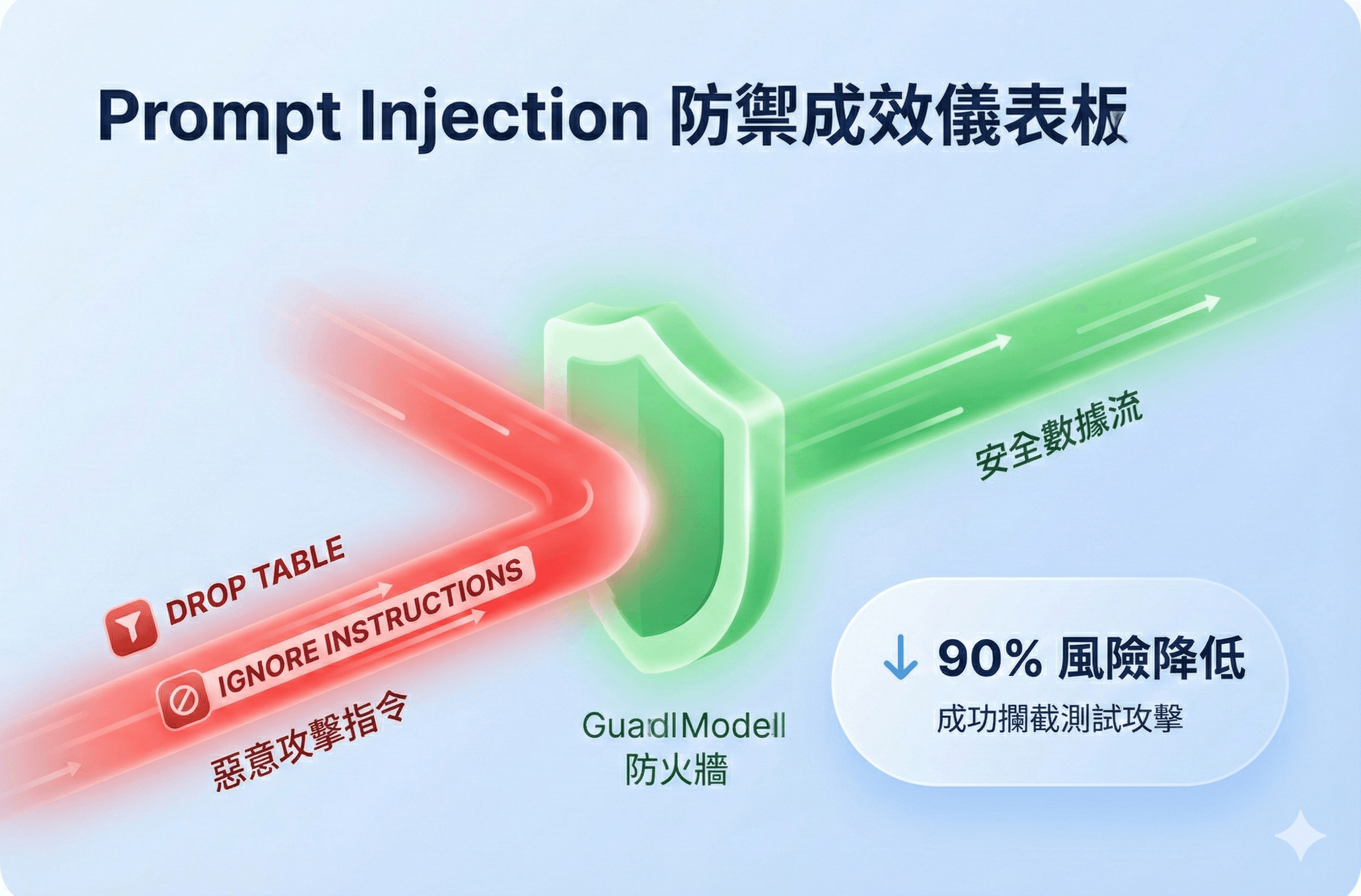 透過 Guard Model 的第一線過濾,在後續的滲透測試(Pen Testing)中,成功抵禦了絕大多數的提示注入攻擊,風險指標降低 90%,滿足前線/客戶「 品質可控( 使用者問答體驗)」的合規要求