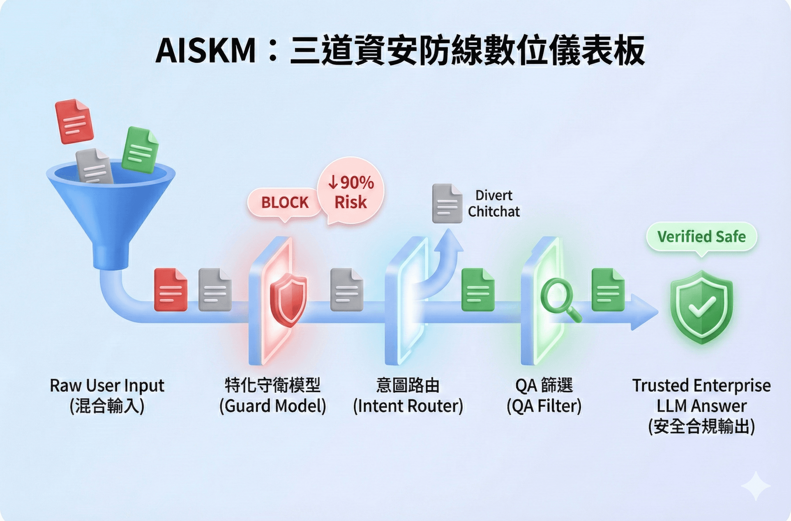 AI Search for KM( AISKM )是一個企業級 RAG 知識中台。為解決企業對資料隱私與資安合規的嚴格要求,本專案在 RAG 檢索鏈路中導入了「三道資安防線」架構。